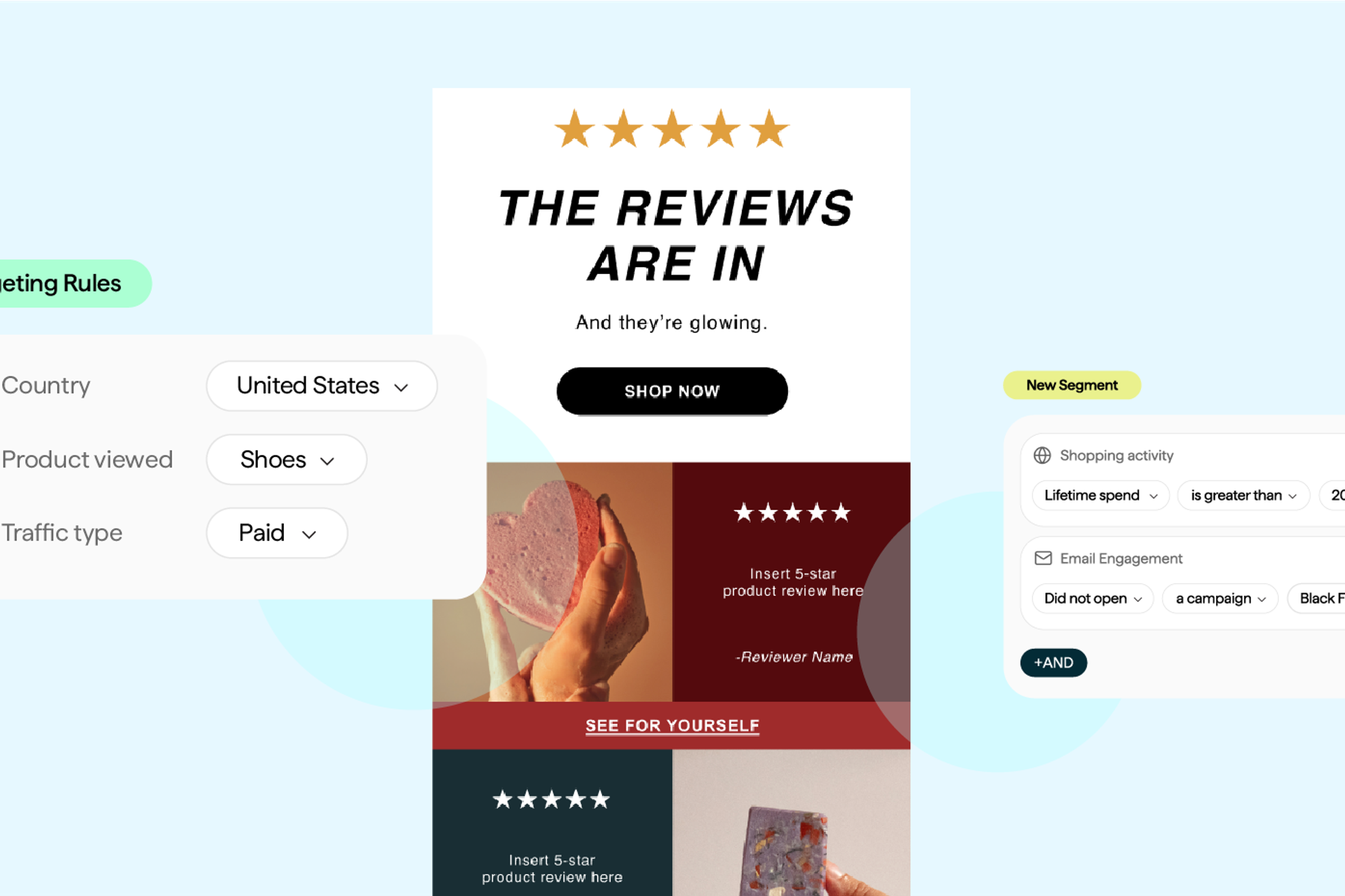 - Welcome series, abandoned cart, order follow-ups